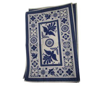 These placemats feature an intricate Talavera tile-inspired design in vibrant blue and white, evoking traditional Mexican artistry. Crafted from durable cotton fabric, they add an elegant and cultural touch to dining decor. The set includes four pieces, each with a detailed floral and bird motif. An ideal choice for adding style to meals.