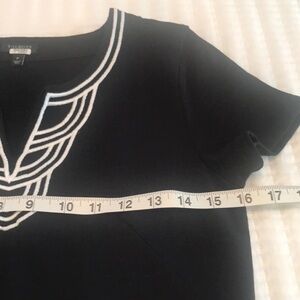 Talbot black pullover dress, beautiful white embroidery detail at V-neckline, short sleeves, darts in front and back for flattering look, 100% cotton, soft fabric, in excellent pristine condition, like new.