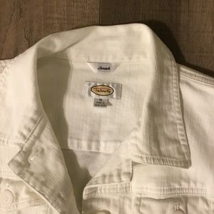 White Talbot Stretch jacket, 99% cotton, 1% spandex. Machine wash, cold water, tumble dry. Very casual, Size M,