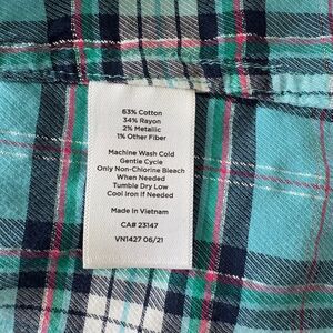 Talbot Long Sleeve Button Front Shirt. Size Large. Collar and full button front. Buttons at sleeve cuff. Cotton 63%, rayon 34%, metallic 2%, other 1%. Approx. measurements: pit to pit 18", shoulder to bottom hem 26", sleeve 26" long. Excellent preowned condition. No flaws.