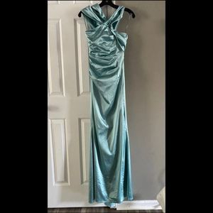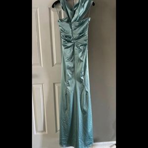 Regal and majesty come to mind with this one-shoulder gown. Ruched at the waist with a side slit, the bold satin finish lends supple textures to this piece.