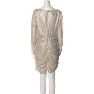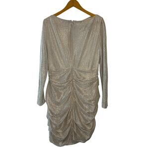 Shimmer in sophistication with this stunning Talbot Runhof cocktail dress. Crafted in Germany, this elegant mini dress features a gold and silver metallic shimmer fabric with a draped silhouette, long sleeves, and a flattering ruched detail throughout. The bateau neckline adds a timeless touch while the bodycon fit makes it perfect for evening events, cocktail parties, weddings, and holiday celebrations.