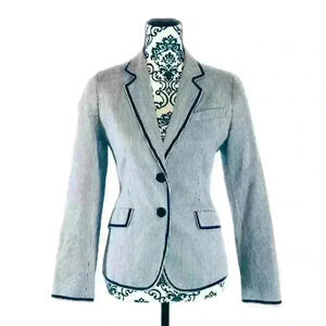 Notched lapel with blue piping on collar, sleeves and pocket