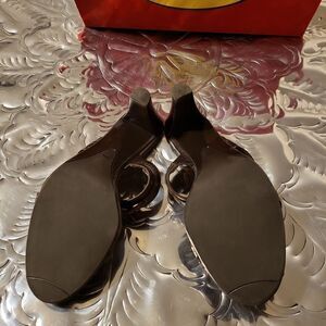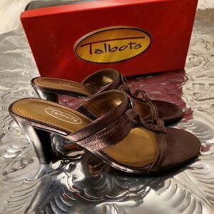 TalbotbronzeT-strap w/Brass accent heel sandal..deep bronze sz. 6