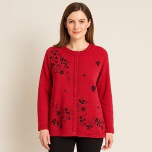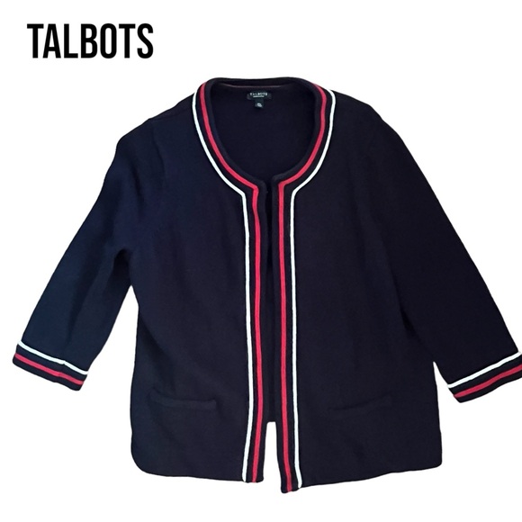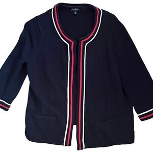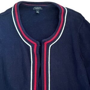 Talbots 100% COTTON NAVY BLUE CARDIGAN SWEATER 1XP Petite RED WHITE STRIPED TRIM