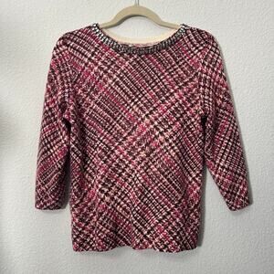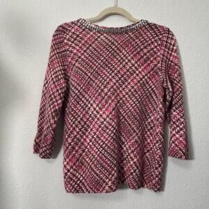 Talbots 100% cashmere sweater! This luxurious piece features a chic houndstooth pattern in beautiful shades of pink and brown, accented by a dazzling rhinestone neckline. Perfect for adding a touch of sparkle to any occasion!