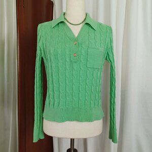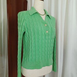 Johnny collar, Talbots 100% cotton cable-knit sweater in the preppiest mint green, with shiny gold tone insignia buttons - serious old money vibes