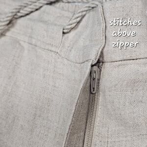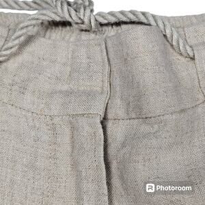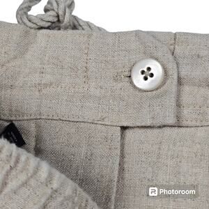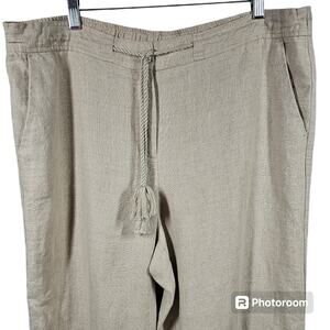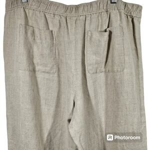 This is a pair of beige, 100% linen, wide-legged, cropped pants in a Women's Size 16 in VERY GOOD, PRE-OWNED CONDITION. They feature a rope-like drawstring and elastic at the waistband, side front pockets, and back patch pockets.