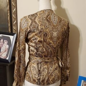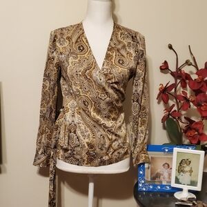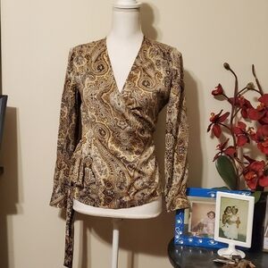 Elegant wrap top with paisley pattern. Long sleeves. V-neckline. Perfect for casual or formal wear.