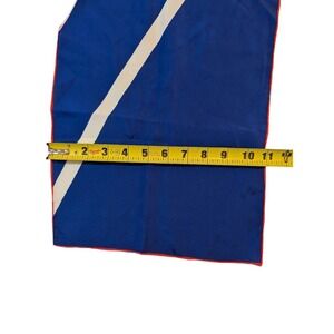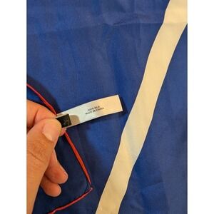 Great, pre owned condition, no flaws noted. Elegant silk scarf with vibrant geometric color-blocking. This lightweight scarf showcases an eye-catching design with sections of royal blue, bright pink, and black, accented by bold white stripes and fine red edging. Crafted from luxurious 100% silk, this statement piece offers a soft and smooth texture.