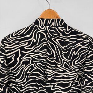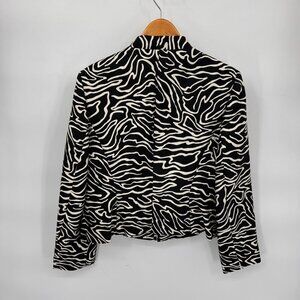 In the enchanting realm of fashion, this zebra print blazer weaves a tale of elegance and sophistication. Crafted with a luxurious silk and wool blend, it beckons the discerning fashionista. Its striking black and white pattern, reminiscent of a zebra's stripes, adds a touch of wild allure to any ensemble, transforming the wearer into a style icon.