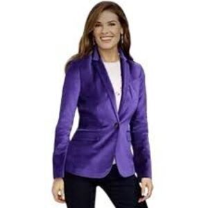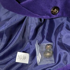 Gorgeous purple velvet one button blazer featuring notch h collar, one breast pocket and two covered patch pockets (basted closed) back slit also basted closed. Comes with extra buttons.