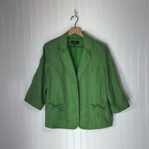 Talbots 12W Green Linen Cotton Blazer Bow Pockets 3/4 Sleeve Jacket Retro Chic