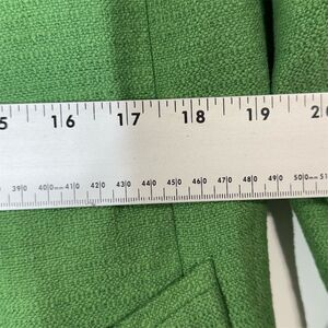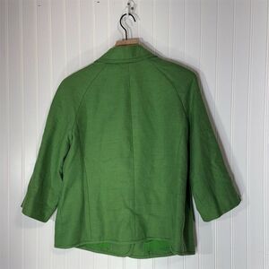 Talbots Woman cropped green blazer in size 12W featuring a cotton-linen blend shell and full cotton lining. This classic-yet-playful jacket has 3/4 sleeves, a collared neckline, bow pocket details, and a boxy tailored fit. Made in Vietnam from a midweight woven fabric, this piece blends timeless tailoring with vintage-inspired charm.
