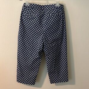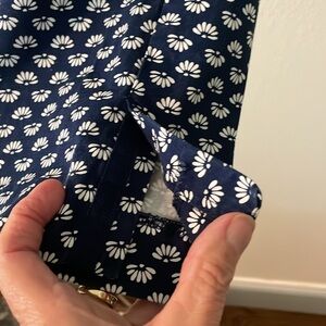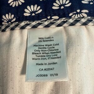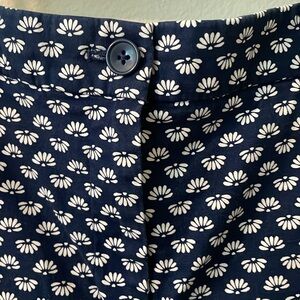 Talbot navy capris with cute daisies. Wide waistband with loops and 4 pockets that are almost hidden because of the subtle pattern. 18 inch inseam and 28 inch length. 98% Cotton and very comfortable and cool. The material is soft and doesn’t wrinkle! Very good condition.