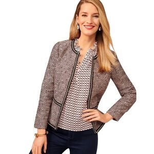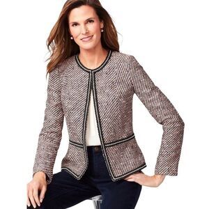 So elegant, this tweed jacket can be worn with suit pants or even a pair of jeans for a polished-casual look. Grosgrain trim around the jewel neckline, waist, and hem flatters and streamlines.