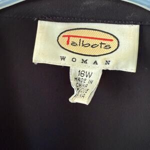 Talbots black blazer in a women's size 16W. This lightweight blazer is perfect for layering. It is unlined and has removable shoulder pads for a customizable fit. A versatile addition to any wardrobe!