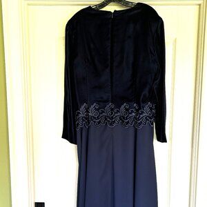 Midnight blue 100% rayon velvet top and sleeves with dark blue embroidered trim and cord trim at neckline.