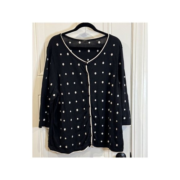 Chic Talbots Plus cardigan featuring a black knit with white polka dots, contrast white trim along the V-neck, button placket, and hem, and 3/4-length sleeves. Soft, lightweight knit —ideal for layering over tanks, blouses, or dresses across multiple seasons. Size 2X with a relaxed fit and full button front; in excellent used condition. The tag is pretty faded. I think it says 60% cotton and that is all I can read on the faded tag (pictured). Approximate measurements: 23.5 armpit to armpit; 25 in. length. Please ask all questions prior to purchase.