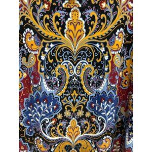 This dress offers a sophisticated look with its striking paisley design and colorful palette. Its 3/4 sleeves and tunic style provide comfort and versatility, making it suitable for various settings. Crafted by Talbots, it showcases quality and attention to detail. A perfect addition to any wardrobe collection.