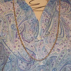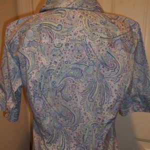 The colors on this blouse are popping!! Blues, greens, purple and pinks. Button down the front with a v-neck and cuffs on the end of 3/4" sleeves.
