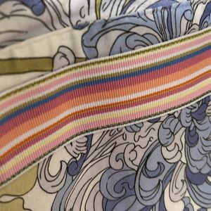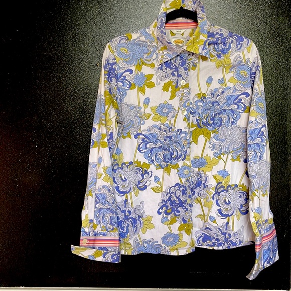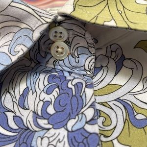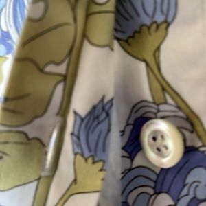 more of a lavender 💙blue and a hint of sage green 💚button down shirt with stripes on the cuff in hues of 💗pink on the cuff of the sleeves with one button on each sleeve.. which I adore ❤️two buttons at the top of the neck