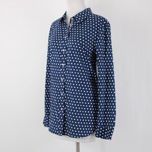 Talbots $70 Sz L Navy Blue White Polka Dots Button Collared 100% Cotton Top