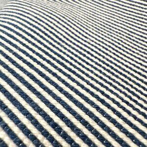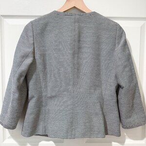 Navy and white thin tweed striped women's jacket with large navy button closure. Features three front functional pockets that are still sewn closed for form-fitting. Fully lined with silky polyester and shoulder pads for structure. Perfect preppy, classic jacket for any season.
