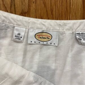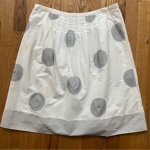 Talbots A Line Skirt Size 10P White Geometric Cotton Lined This Knee Length skirt is 100% cotton. It has a side zip and the waist has cleats. This is a white skirt with black stitched geometric circles throughout. The entire skirt is lined and is very good quality.