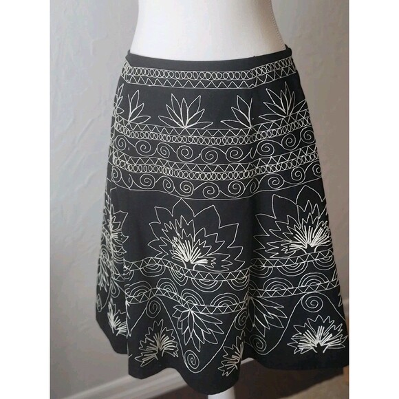 Talbots A-Line Skirt Black Floral Embroidered Lotus Flower Boho Retro Sz 6