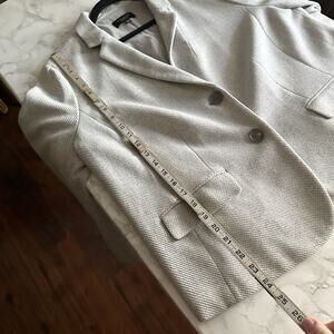 Gray twill knit blazer with darker gray pop under collar and gray button front closure and cuff