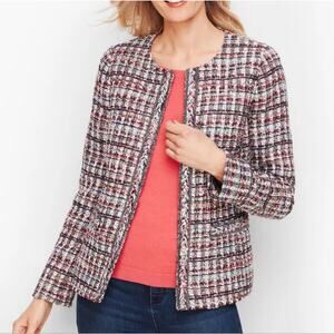 In timeless tweed, this chic jacket features pretty braided trim and feminine lines that flatter.