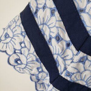 Round neck short sleeve top with hidden side zipper. White cotton with light blue floral applique embroidered eyelet flowers. Dark blue grosgrain ribbon stripes. Lined bodice, unlined sleeves and hemline.