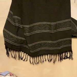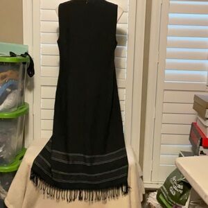 This sophisticated black sheath dress by Talbots features a sleeveless design with a flattering V-neckline, perfect for cocktail parties or a night out. The asymmetrical cut adds a modern twist to its classic silhouette, while the tiered fringe embellishment at the hem provides a touch of elegance and movement.