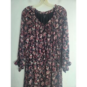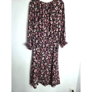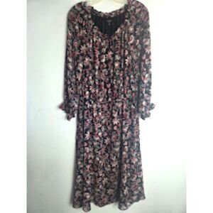 Talbots Black Brown Red Floral Print Braclet Sleeve Autumn Garden Midi Dress Large Petite, great condition