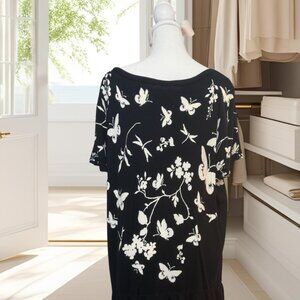 🦋 Beautiful Talbots 2x black knit top featuring white butterfly and floral print with a playful ruffle hem. Like-new condition—no flaws