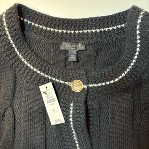 Brand new, never worn Talbots black cardigan with gold buttons. Wool blend so very warm but still soft. It was just a little too small for me. Measurements in the photos.