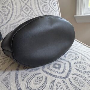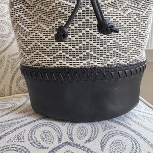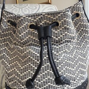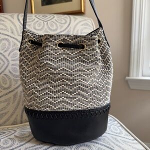 Chic and versatile Talbots bucket bag, approx. 10” x 10”. Features a stylish black and cream textured design with black faux leather trim and drawstring closure. Inside is roomy and clean, with one small spot from a blue pen—otherwise in great shape. Perfect for everyday wear with a touch of classic charm!