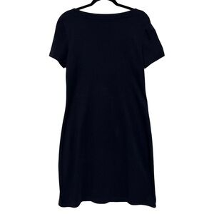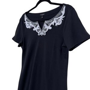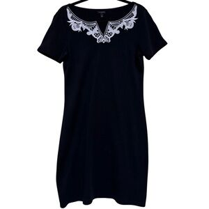 This is a Talbots Women's Black Embroidered Rounded V-Neck Short Sleeve Knit Dress. Falls close to knee, fitted, with a straight cut. The dress has a notched v-neckline with embroidered detailing around it. Ideal for versatile wear.