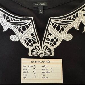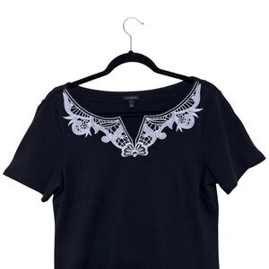 Talbots Black Dress White Lace Applique Round V-Neck 100% Cotton Size M