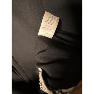 Elegant black dress. Features cream lace trim at hem. Sleeveless design. Perfect for formal or business occasions.