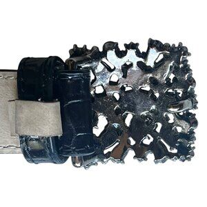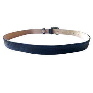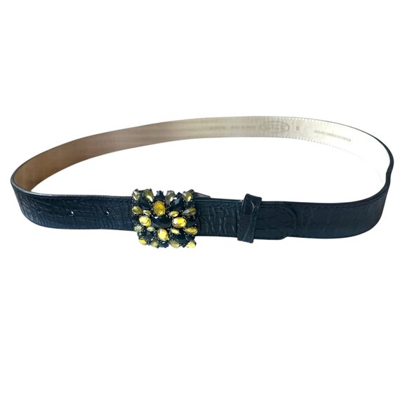 Talbots Black Embossed Leather Belt Faceted Gemstone Style Buckle 30” - 34” GUC
