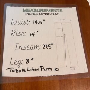 In like new preowned condition with no flaws: no tears, wear, stains or smell. Comes from smoke free home. Size 10. Measurements laid flat: waist 14.5”; hip 21”; inseam 27.5”; front rise 14”; back rise 16”; leg opening 8”.