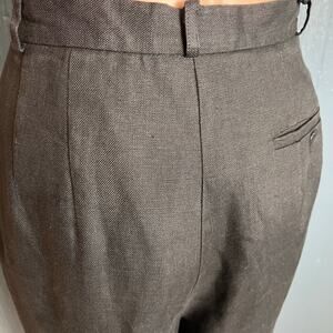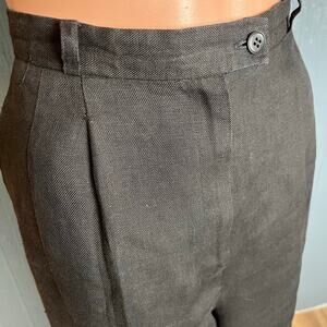 These Talbots black dress pants are 100% Irish linen. Pleated front, polyester lining. Hip slash pockets, back buttoned pocket. High rise style. The waistband does not stretch.