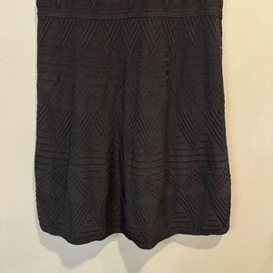 Chic black mini dress with textured geometric design. Ideal for versatile styling.