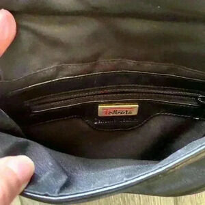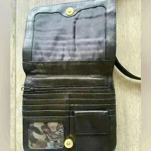 Talbots black leather shoulder/crossbody adjustable strap compact purse has center open pocket and flaps on front and back. Front flap reveals an open space good for cosmetics, phone, keys with a back zipper pocket. Back flap opens to slots for 7 cards plus an ID holder with clear cover and a change purse and a zippered compartment for bills, etc.