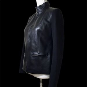 Incredibly soft and smooth black leather-front jacket with matte scuba material back and sleeves.