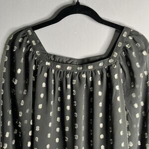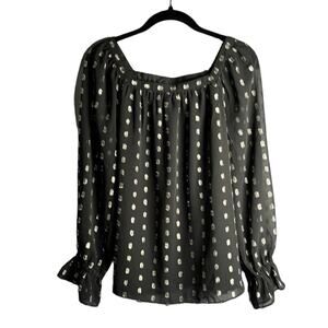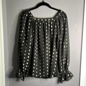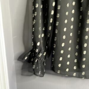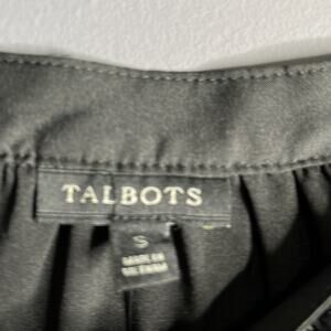 This NWT Talbot’s black long sleeve fully lined blouse in a size small is an elegant and stylish piece that exudes sophistication. One of the standout features of this blouse is the silver metallic polka dot pattern that adorns the fabric.