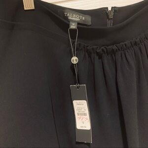 This NWT Talbots black skirt features a pleated gather front skirt and rear zipper. Light weight and very flattering knee length. Camouflage your mom pouch. Size 12