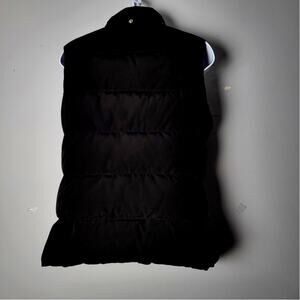 Stay warm and stylish in this Talbots black puffer vest, size Petites P. Small/medium Designed with a classic minimalist look, this vest features a high collar, snap and zip front, and two flap pockets. The shell and lining are made of 100% polyester, while the fill includes 80% duck down cluster and 20% feathers—perfect for lightweight insulation. There is a small discoloration near the bottom hem (shown in photo), not very noticeable when worn.